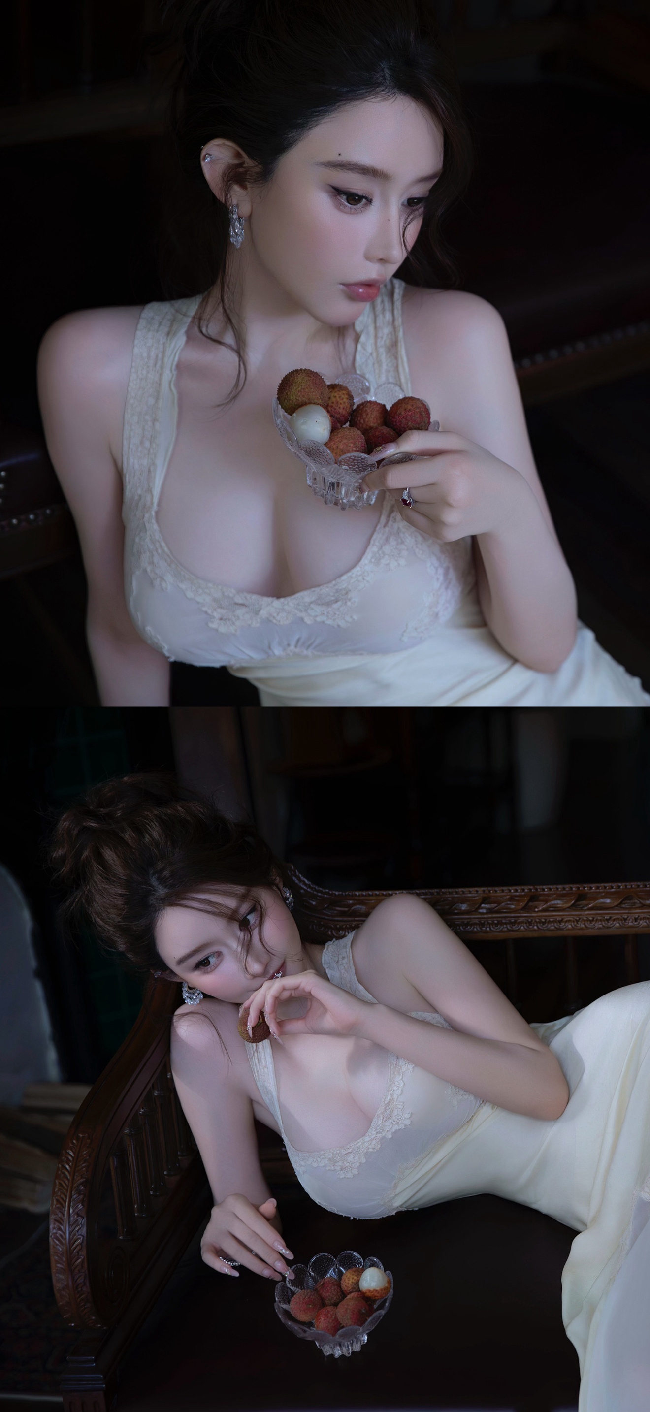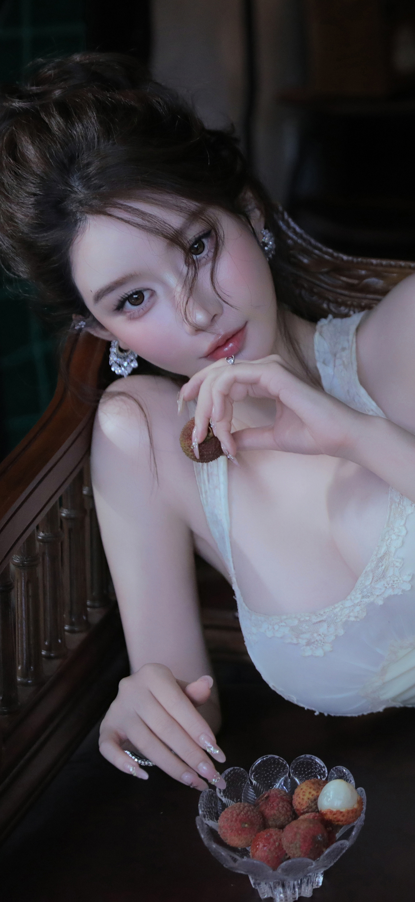 唯美复古风,氛围优雅细腻,蕾丝裙的柔婉与荔枝的鲜润相映,复古椅雕花添古典韵,仿佛踏入复古宅邸的慵懒午后,适配偏爱温婉复古情调的用户。