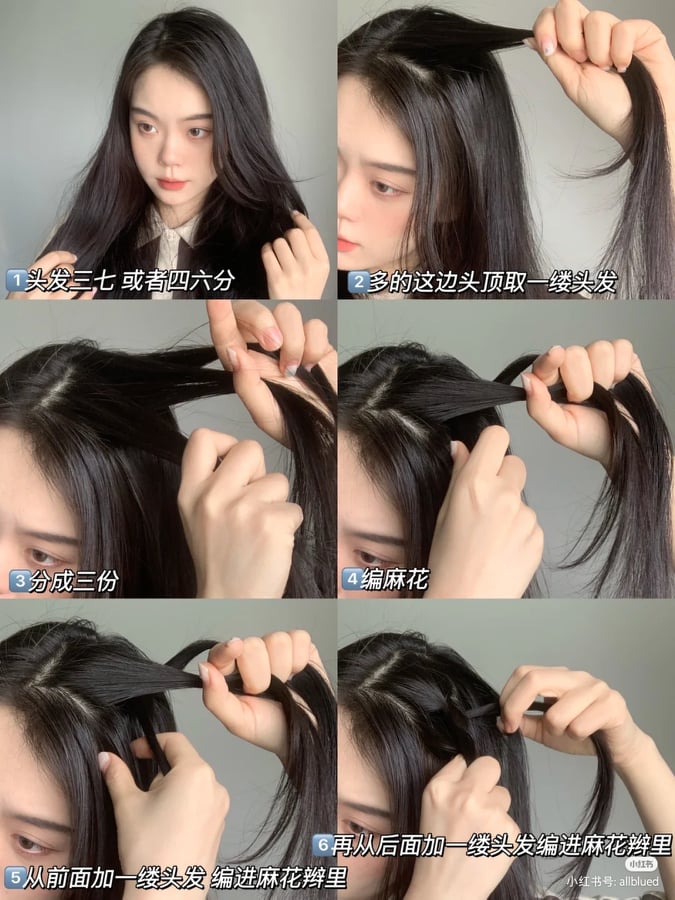 这款发型看起来既蓬松又带点随性慵懒的感觉!先将头发分成三七、四六分,之后将头发比较多的那边从头顶取一缕头发。然后再从中分成三份,编麻花辫。从前面加一缕头发,编进麻花辫里,再从后面加一缕头发编进麻花辫里。