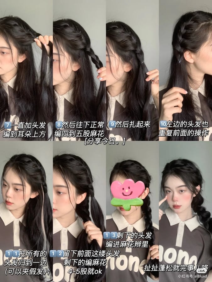 一直加头发编到耳朵上方,然后往下正常编到股麻花辫,再将其扎起来。左边的头发也重复前面的操作,把所有的头发归到一边(可以夹假发片)。留下前面这缕头发,剩下的编麻花股就行了。剩下的头发编进麻花辫里,再将其稍微扯扯蓬松就可以了。