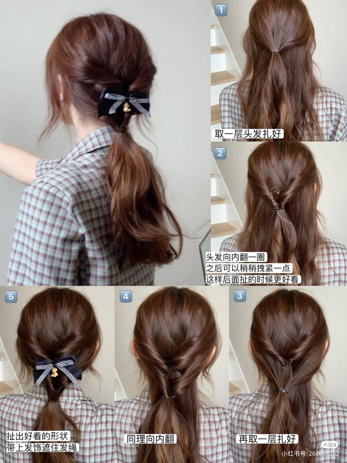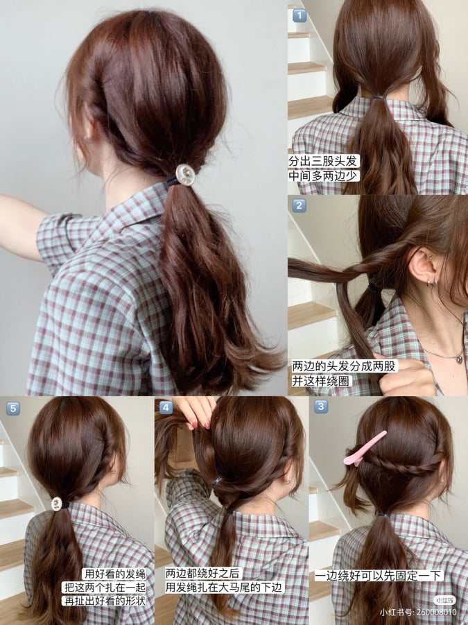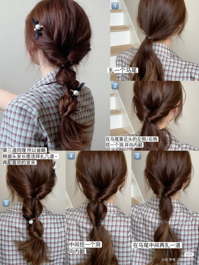 先扎一个低马尾,之后再马尾靠近头的左侧右侧挖一个洞,并向内翻。完成后在马尾中间再扎多一次,同样也是在中间挖一个洞向内翻。可以根据头发的长度选择扎几道,然后搭配上好看的发夹就行啦!