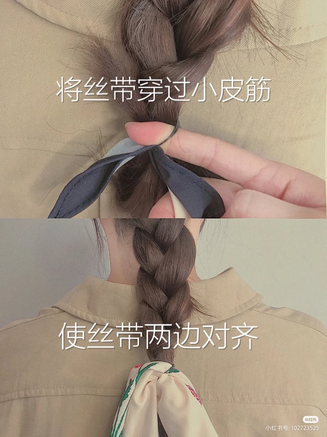 先将头发梳直,将其分为三份,之后再以麻花辫的方式编取发尾后,用橡皮筋扎起来。再将丝带穿过小皮筋,使丝带两边对齐。然后将麻花辫向上反转,翻转后用黑色发卡固定在头发四周。再将丝带系在头发上就可以了,如果丝带过长的话可以再绕多一圈。