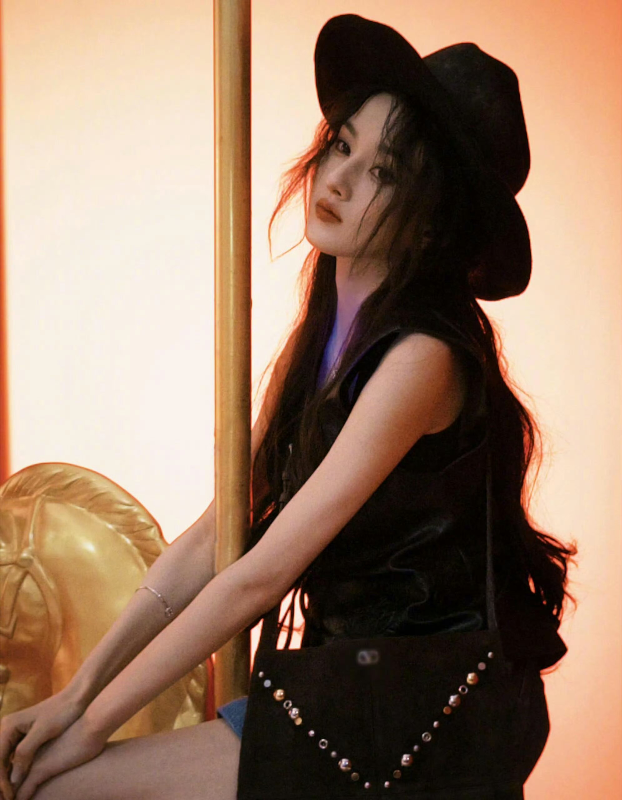 宋祖儿黑色皮衣马甲叠穿简约内搭,搭配牛仔短裙利落率性